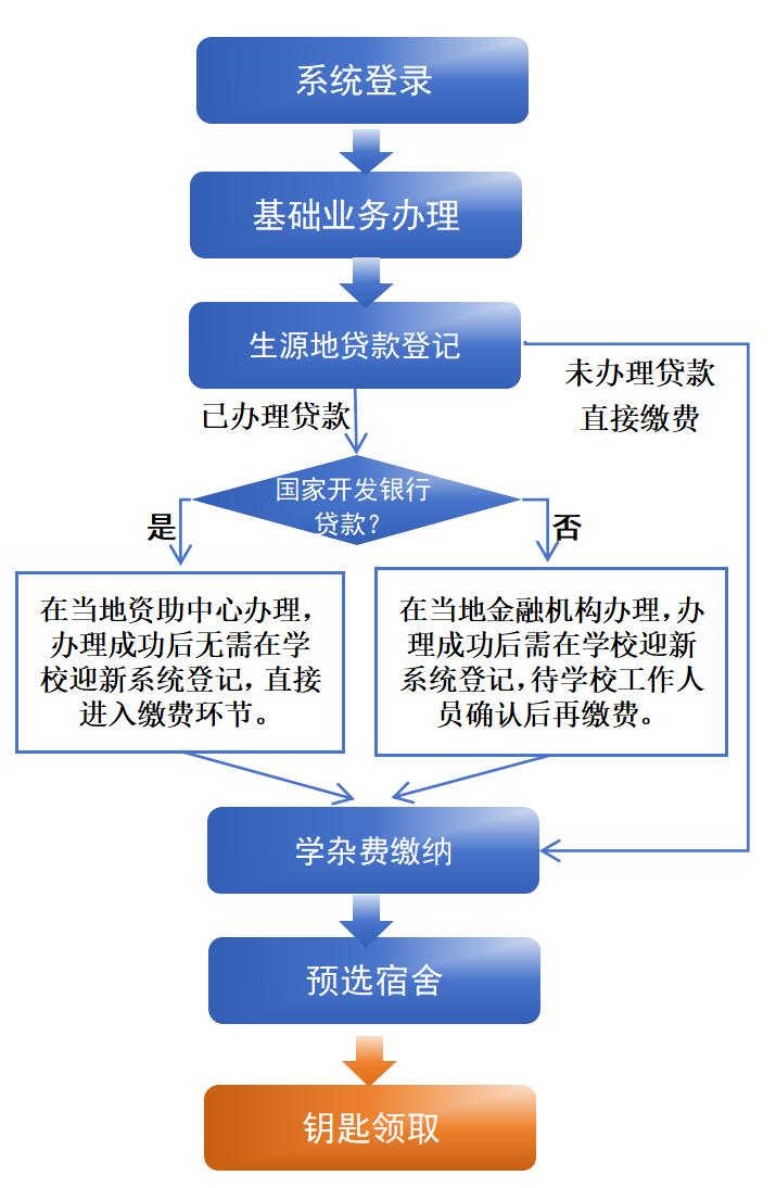 (1)国家开发银行的助学贷款:在当地资助中心办理,办理成功后无需在学校迎新系统登记,直接进入缴费环节。