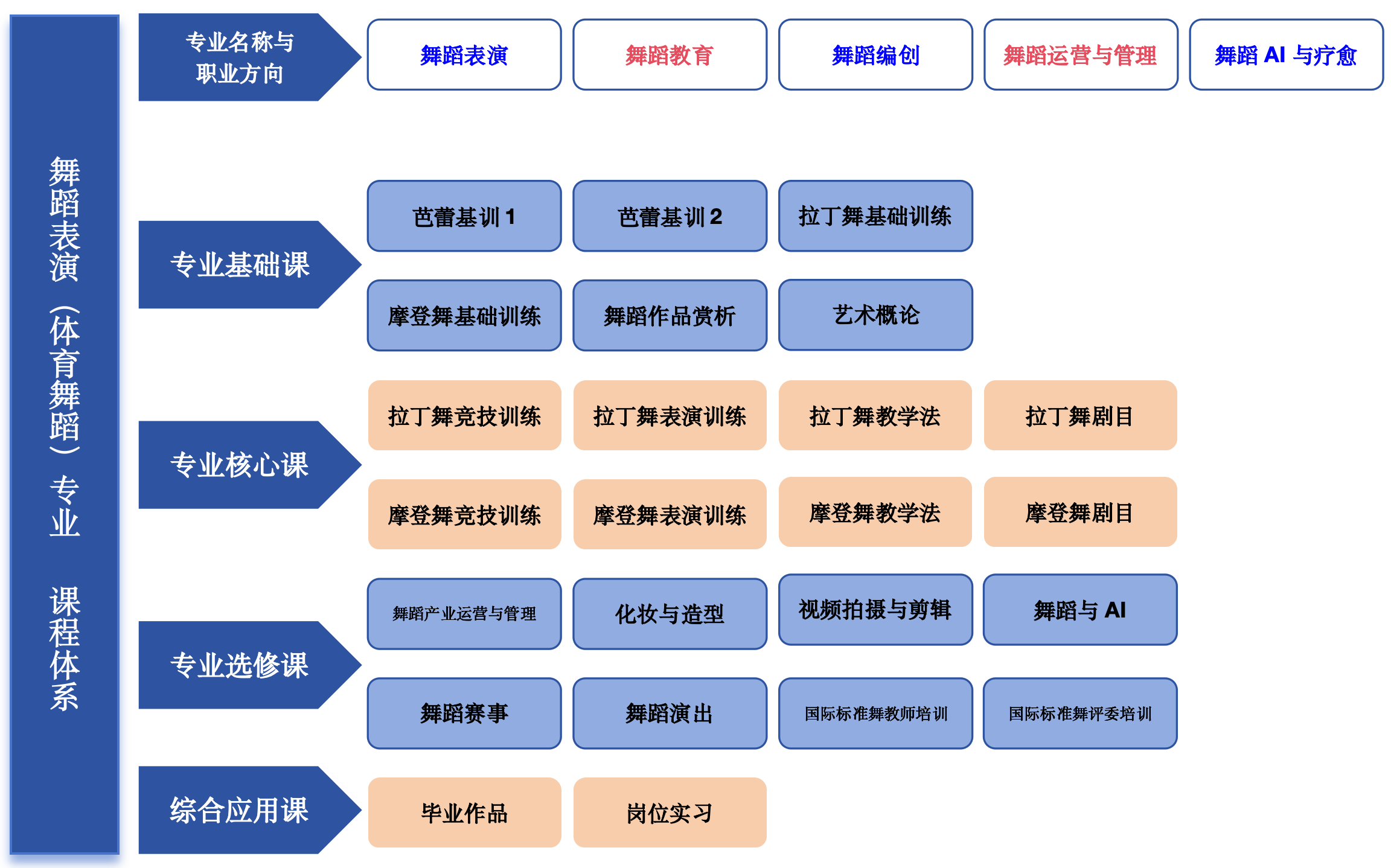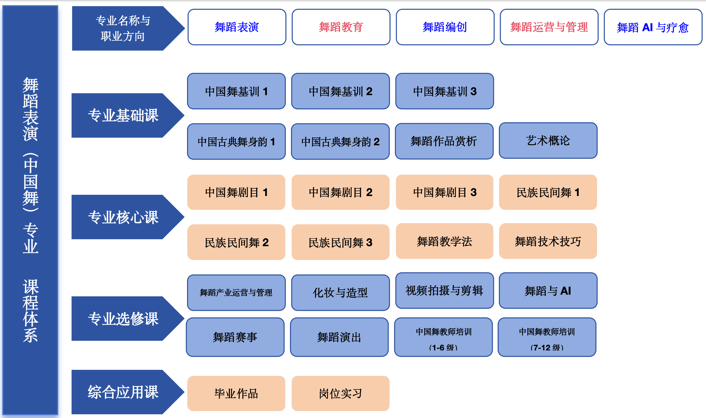 舞蹈运营及管理方向:在各大表演院团、文艺演出单位、传媒公司、艺术机构、赛事组织等单位从事舞蹈运营以及管理工作。