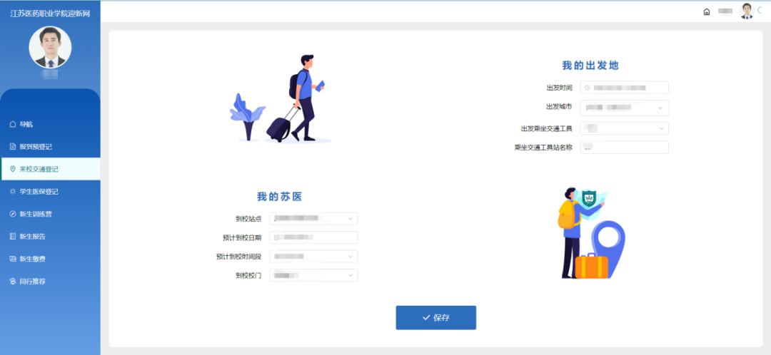 根据自己到校的实际行程情况,填写“来校交通登记”,同时会根据新生行程信息进行“同行推荐”。