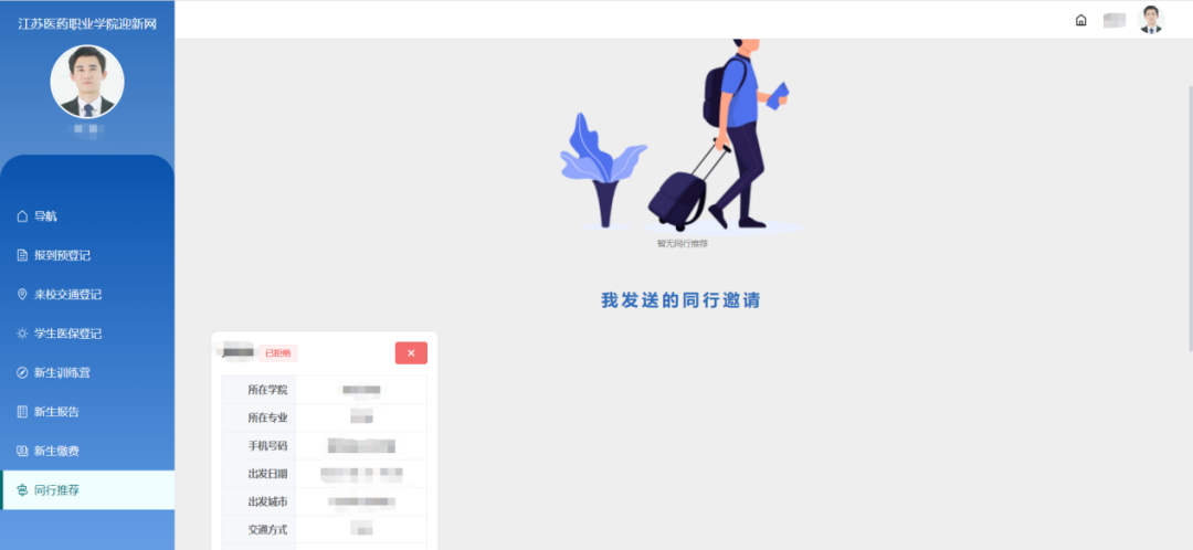根据“来校交通登记”的信息进行“同行推荐”,在列表中可查看与自己行程相近的新生,并可发起“同行邀请”,同时可查看“我收到的同行邀请”,根据自己实际情况进行“确认邀请”和“拒绝”。“确认邀请”后,可查看对方联系方式,并进行联系,若后续行程有变,可取消“邀请”或者更改为“拒绝邀请”。