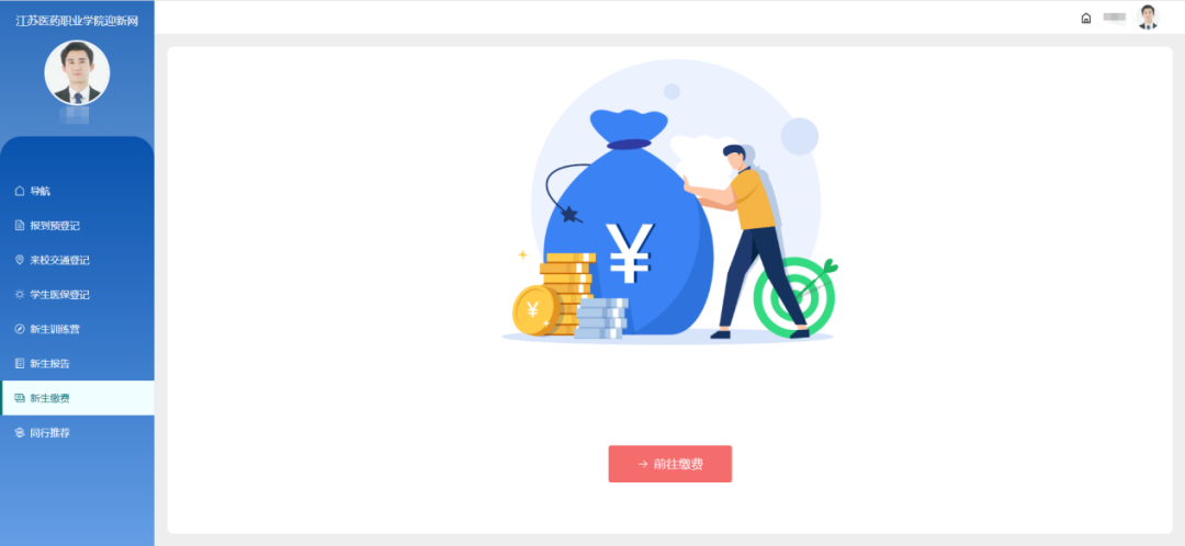 新生可点击“前往缴费”按钮,进入财务系统完成缴费,提示:在缴费前,请务必核实金额。(缴费系统用户名为身份证号,密码为123@身份证后6位)