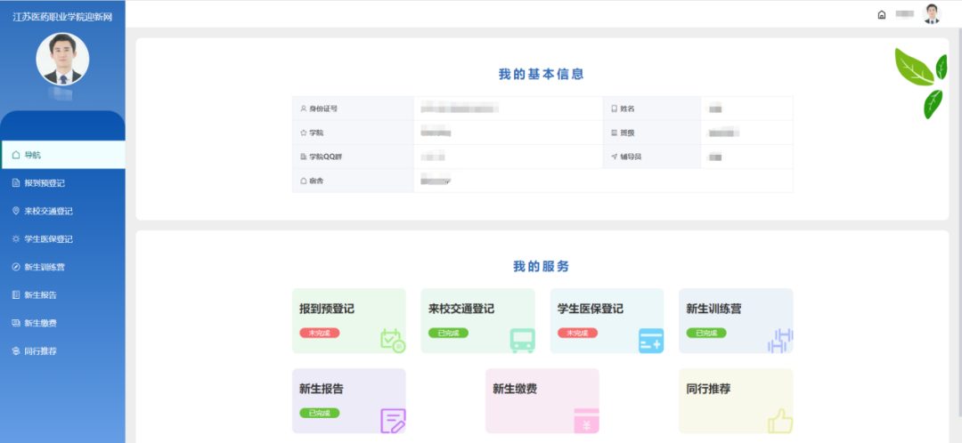 进入待办事项导航页,可以查看自己班级、学号、宿舍、辅导员等相关信息。