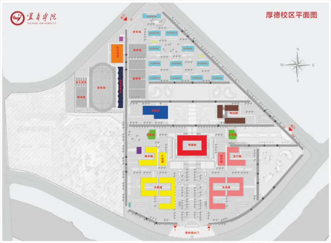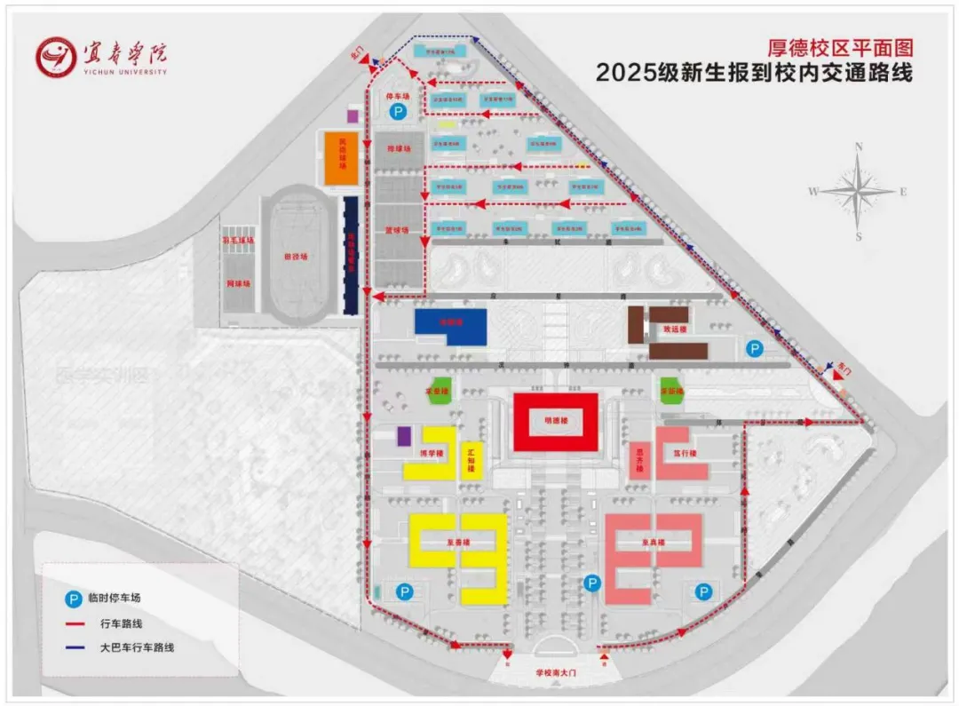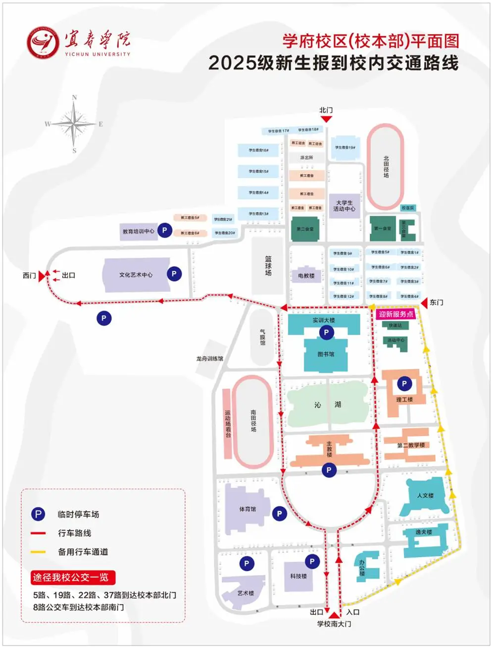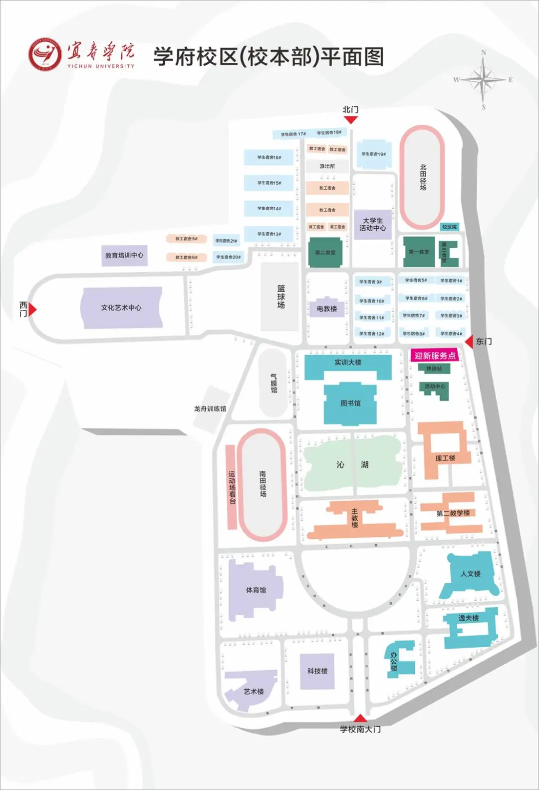 | 亲爱的2025级新同学 欢迎来到宜春学院 大学生活即将拉开序幕 为了帮助同学们平安、顺利报到 学校精心准备了这份新生报到指南 各位萌新速速查收 让我们共赴青春美好之约! 一、报到时间 9月7日 二、报到地点 校本部:江西省宜春市袁州区学府路576号。 厚德校区:江西省宜春市袁州区厚德路6号。 学校在校本部东门小广场、厚德校区学生宿舍7-9栋之间分别设置了新生报到处。 校本部地图导航如下: