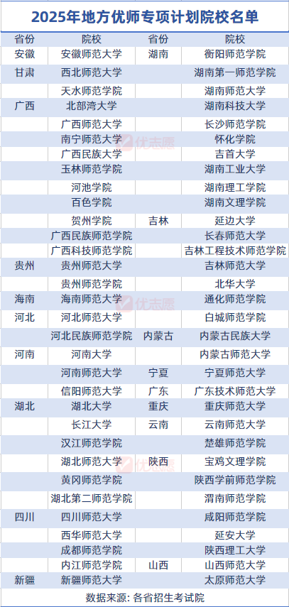 地方优师专项则由中西部省级教育行政部门确定的本科层次师范院校承担培养任务。以下是2025年地方优师专项院校的完整名单: