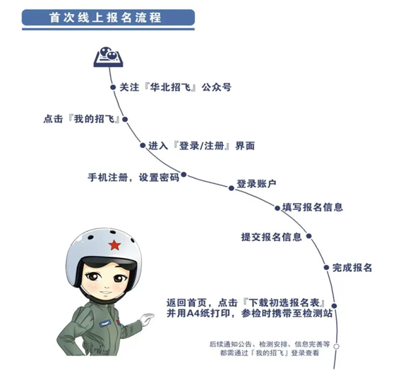 ● 通过华北招飞微信公众号(HBZF-2014)完成线上报名,并下载《空军招飞(青航校招生)报名表》。学校填写推荐意见,逐级上报招生考试部门备案。