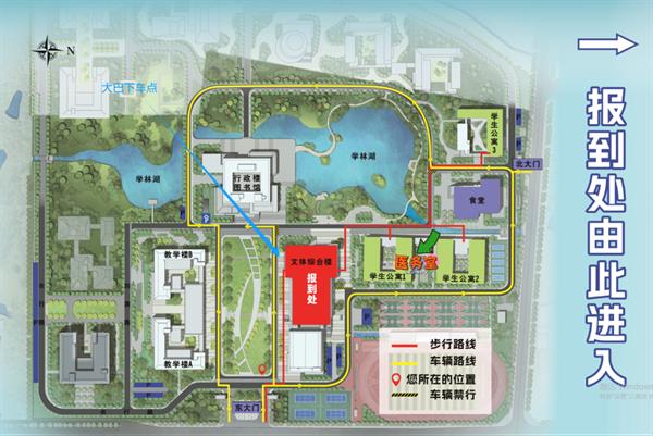 报到当天,学校本部只开放古墩路1516号的西大门,长兴校区只开放新林北路39号的东大门,其他校门一律关闭。自驾车辆进入校园时,请自觉听从安保人员指挥,按指定路线通行及停车,并提醒司机遵守校园交通规则,限速20km/h,免费停车2小时,主动避让行人,确保行车安全。