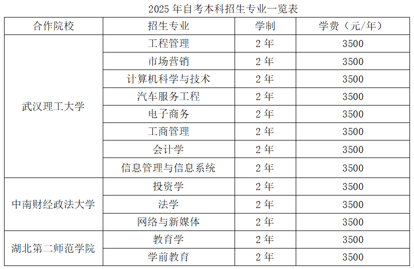 为帮助我校学生获取本科学历,根据湖北省高等教育自学考试委员会(鄂考委[2005]4号)的文件精神,我校与武汉理工大学、中南财经政法大学、湖北第二师范学院联合举办自考本科助学班,现将有关报名事项通知如下: