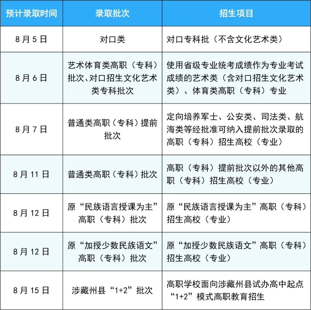8月,高考录取进入普通类、艺术类、体育类等多个招生类型的高职(专科)批次,各批次预计录取时间详见下表。