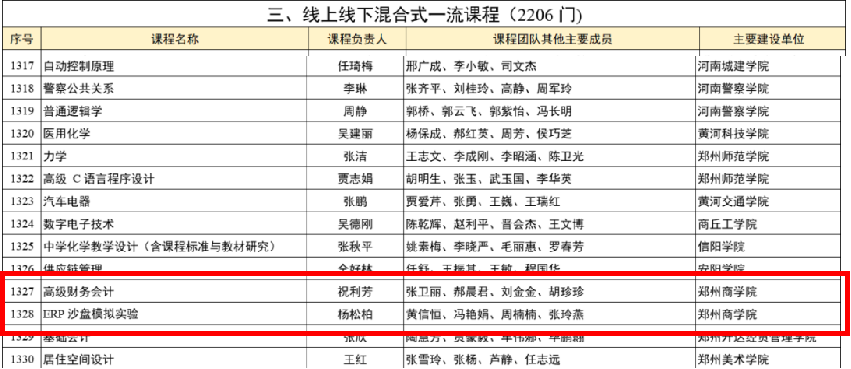近日,教育部公示了第三批国家级一流本科课程认定结果,我校《高级财务会计》《ERP沙盘模拟实验》2门线上线下混合式课程成功入选,获批课程数量在省内同类院校中位居前列。