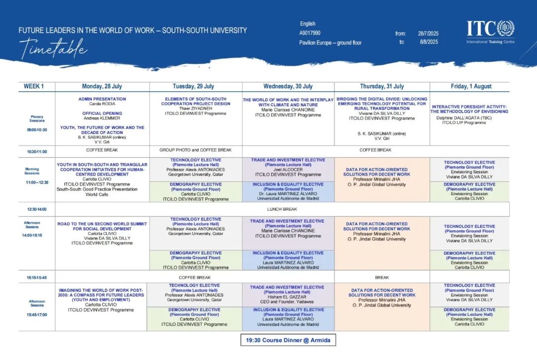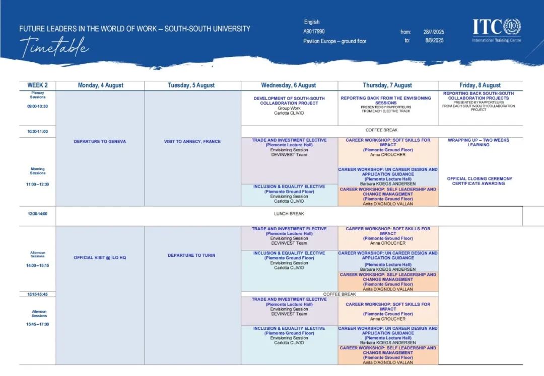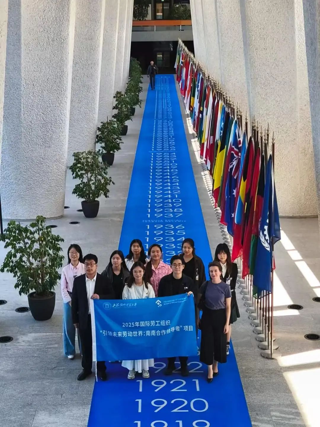 为加强国际组织后备人才培养,拓展学生国际视野,提升全球胜任力,7月28日至8月8日,上海对外经贸大学国际组织学院(贸易谈判学院)选派金子涵、刘茹懿、何卓远、杨巧若、顾菁怡、印玄晔、吴立荃、张明月等8名学生,由吴子杰老师带队参加国际劳工组织国际培训中心(ITCILO)“引领未来劳动世界:南南合作领导者”暑期课程学习。该项目旨在锻造具有全球视野、能够引领未来劳动世界的青年领袖。