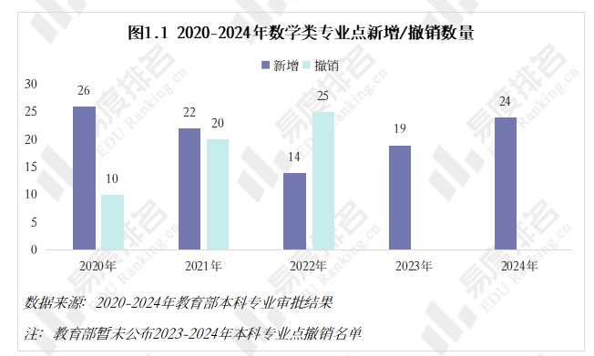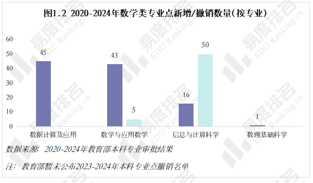 近年数学类专业主要新增数据计算及应用和数学与应用数学两个专业点,撤销专业点基本都是信息与计算科学,该专业就业相对困难,减少专业点也符合市场需求。