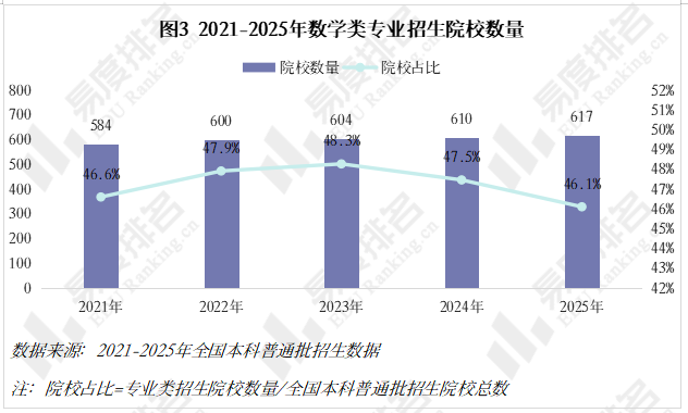在全国高等教育扩招的大趋势下,开设数学类专业并有招生计划的高校数量也同步增长,但增长速度十分缓慢。2025年共有617所本科院校的数学类专业在全国普通本科批招生,较2021年增加了33所。但在本科普通批所有招生院校中的占比却已明显下滑,目前其占比为46.1%,低于2021年的占比。