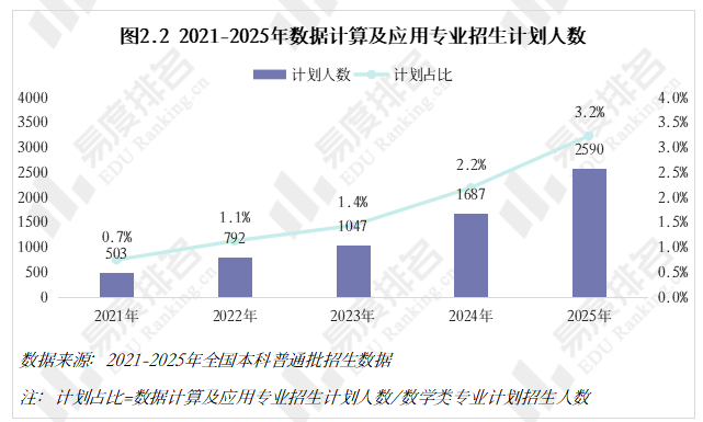数据计算及应用专业是数学类专业中招生计划增幅最大的,2025年计划招生2590人,较2021年增长了4倍,该专业计划招生人数在专业类中的占比也从2021年的0.7增长至3.2%。