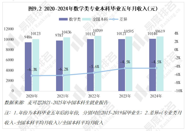 数学类专业本科毕业五年月收入与全国本科平均月收入的差距更为明显,到2024年该专业类毕业五年的月收入为10146元,比全国本科平均水平低了4.5%。数学类专业毕业半年时收入水平与全国平均水平相差无几,但毕业五年后差距明显拉大,就业时间越长,与平均水平的差距反而越大。