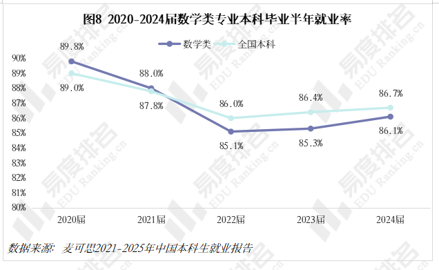 受整体就业形势影响,近年数学类专业毕业半年就业率下滑严重,从2023届开始有所好转,到2024届毕业半年就业率回升至86.1%,但仍低于全国本科平均就业率。