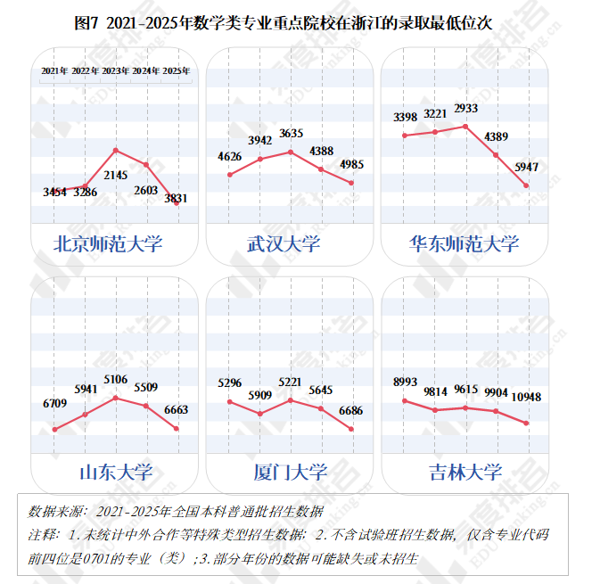2021-2023年重点高校的数学类专业在浙江的最低录取位次总体呈上升趋势,但2024年开始各重点院校的位次均出现下滑,2025年则延续下降趋势,各高校的最低位次基本都低于2021年的最低位次。