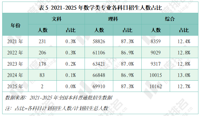 2021-2025年数学类专业招收理科\物理以及综合考生的计划数均增长,而招收文科\历史考生的计划数逐渐减少,到2025年数学类专业招收文科生的名额仅剩2个。