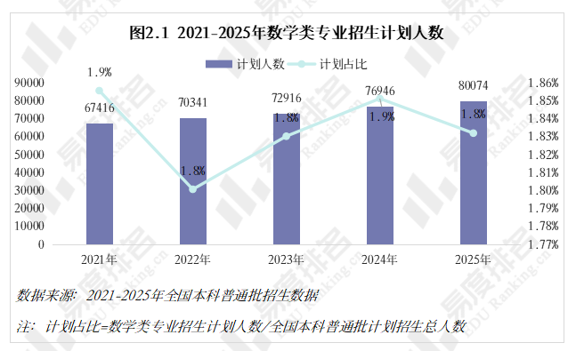 数学类专业2025年计划招生超8万人,较上年增长3100余人,增幅为4%。近年该专业类计划招生人数在全国普通本科批的占比基本稳定在1.8%左右,波动较小。