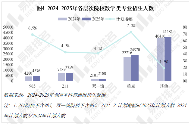 2025年985及重点层次院校数学类专业招生计划增幅在7%左右,而其他层次高校计划增幅仅1.9%。