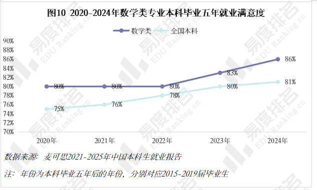 2020-2022年数学类专业毕业五年的满意度维持在80%,2023年开始明显上升,到2024年毕业五年就业满意度达到86%,在各专业类中处于前四位置。数学类专业毕业后主要在金融、信息、教育等行业工作,工作环境相比制造业等第二产业要好很多,因此就业满意度较高。