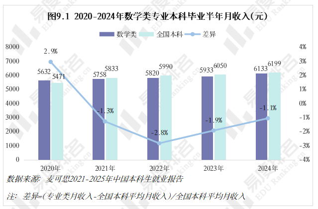 2025年高考数学类专业在普通本科批计划招生达到8万人,较上年计划人数增幅4%。数学类专业毕业后就业时间越长,收入与全国本科平均水平的差距越大,但就业满意度较高,在各专业类中处于前四位置。