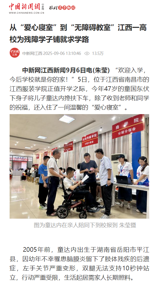 “欢迎入学,今后学校就是你的家!”5日,位于江西省南昌市的江西服装学院正值开学之际,今年47岁的童国东伏下身子将儿子童达内搀扶下车,除了收到老师和同学的祝福,还入住了一间温馨的“爱心寝室”。