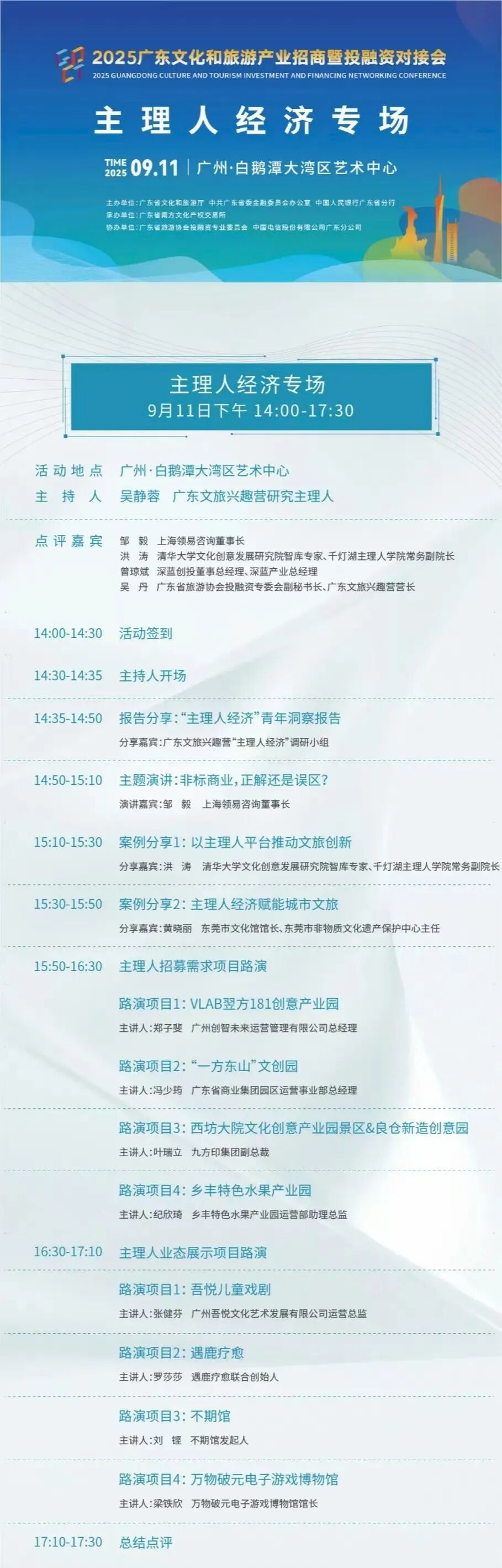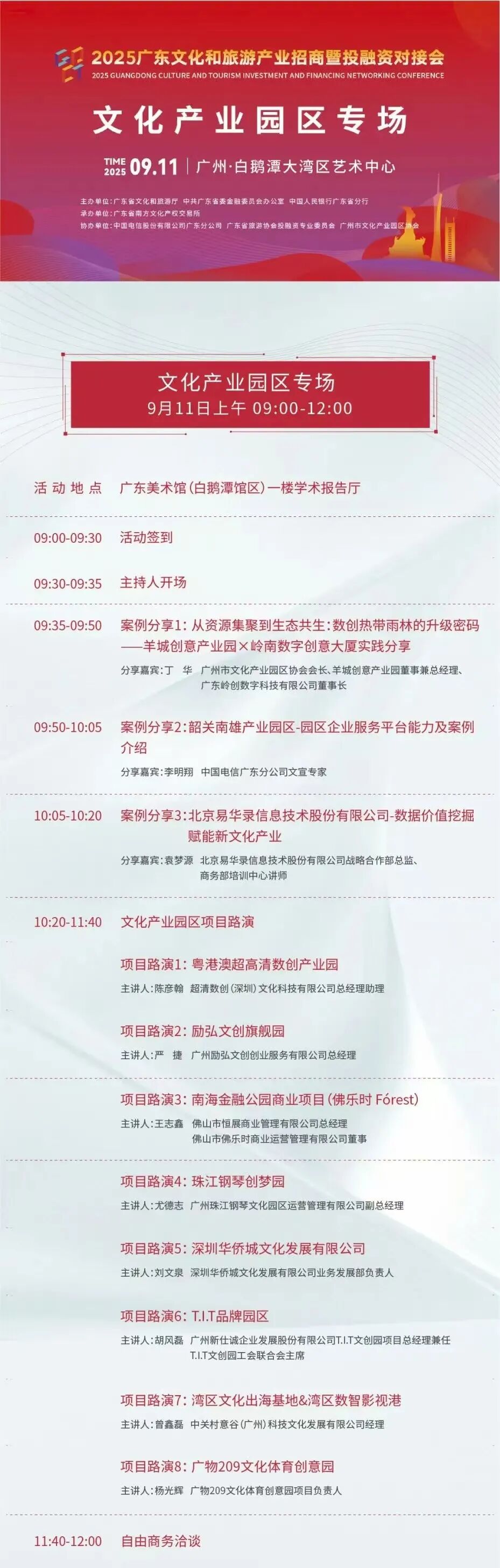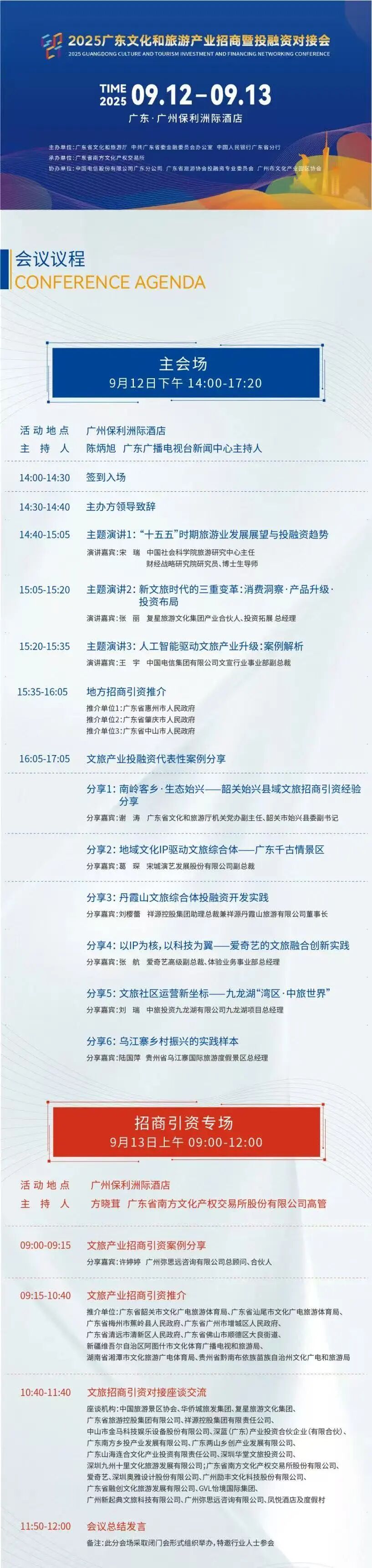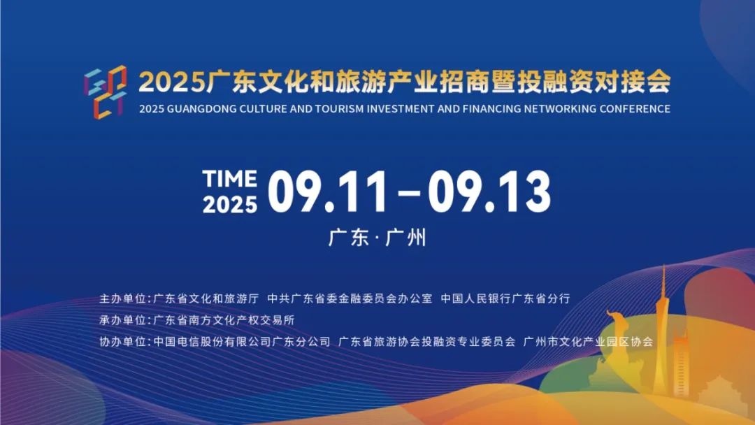 由广东省文化和旅游厅、中共广东省委金融委员会办公室、中国人民银行广东省分行主办,广东省南方文化产权交易所承办,中国电信股份有限公司广东分公司、广东省旅游协会投融资专业委员会、广州市文化产业园区协会协办的“2025广东文化和旅游产业招商暨投融资对接会”(以下简称“广东对接会”)将于9月11-13日在广州举办。
