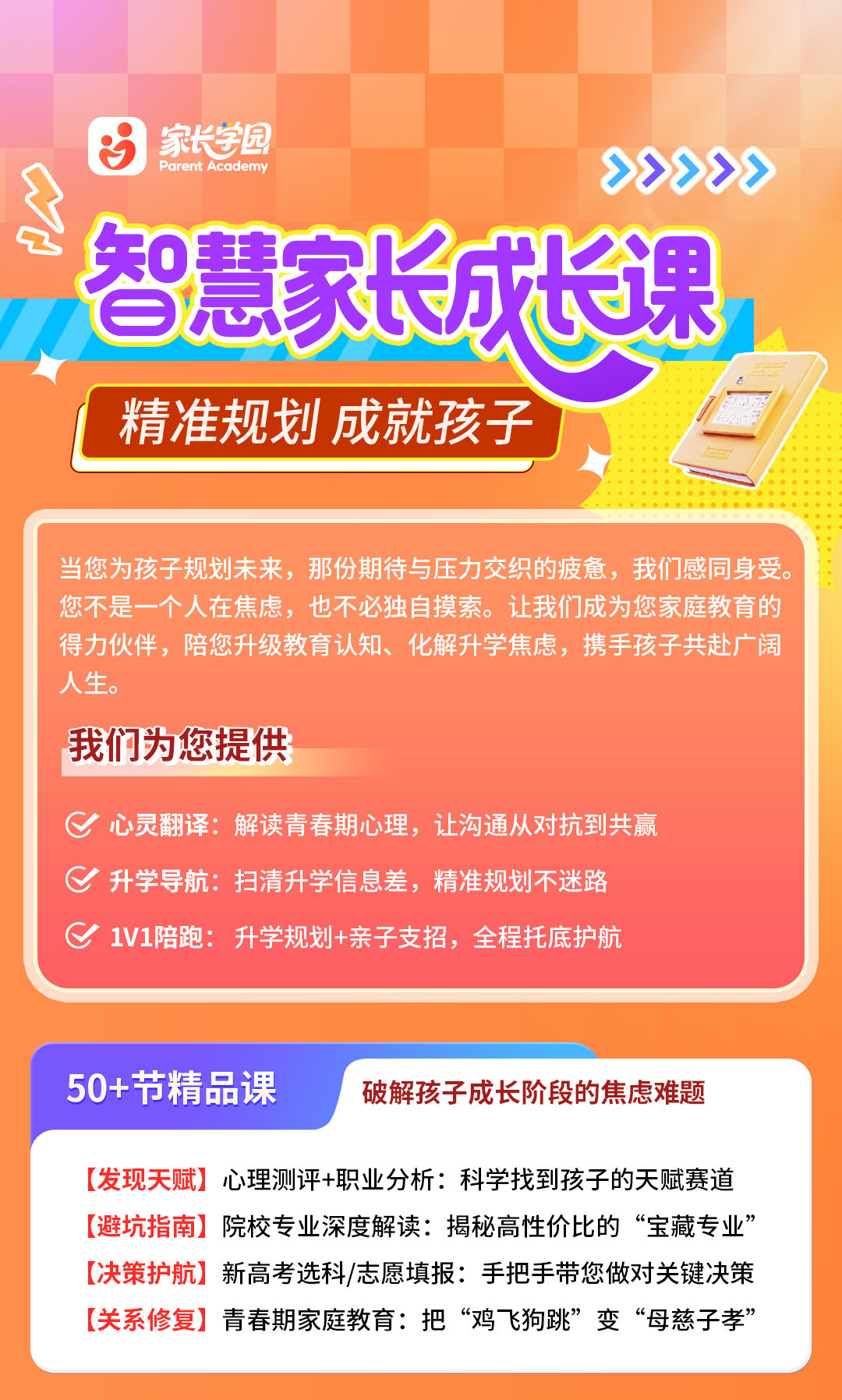 当孩子踏上高中求学路,尤其是临近升学关键期,整个家庭仿佛都被无形的压力笼罩。作为家长,你是否常常深夜难眠,一边担心孩子因青春期叛逆与自己渐行渐远,满心关心却总换来争吵对抗;一边又对着繁杂的升学信息手足无措,新高考选科不知如何匹配孩子优势,志愿填报怕因不懂规则错过好机会,更怕选错专业让孩子未来走弯路。