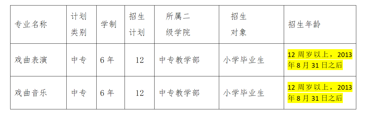 3.戏曲表演专业招收:男生8人,女生4人;戏曲音乐专业招收:板胡1人、琵琶1人、古筝1人、打击乐5人、唢呐(笙)4人。对确有专业基础的优秀生源放宽年龄限制。
