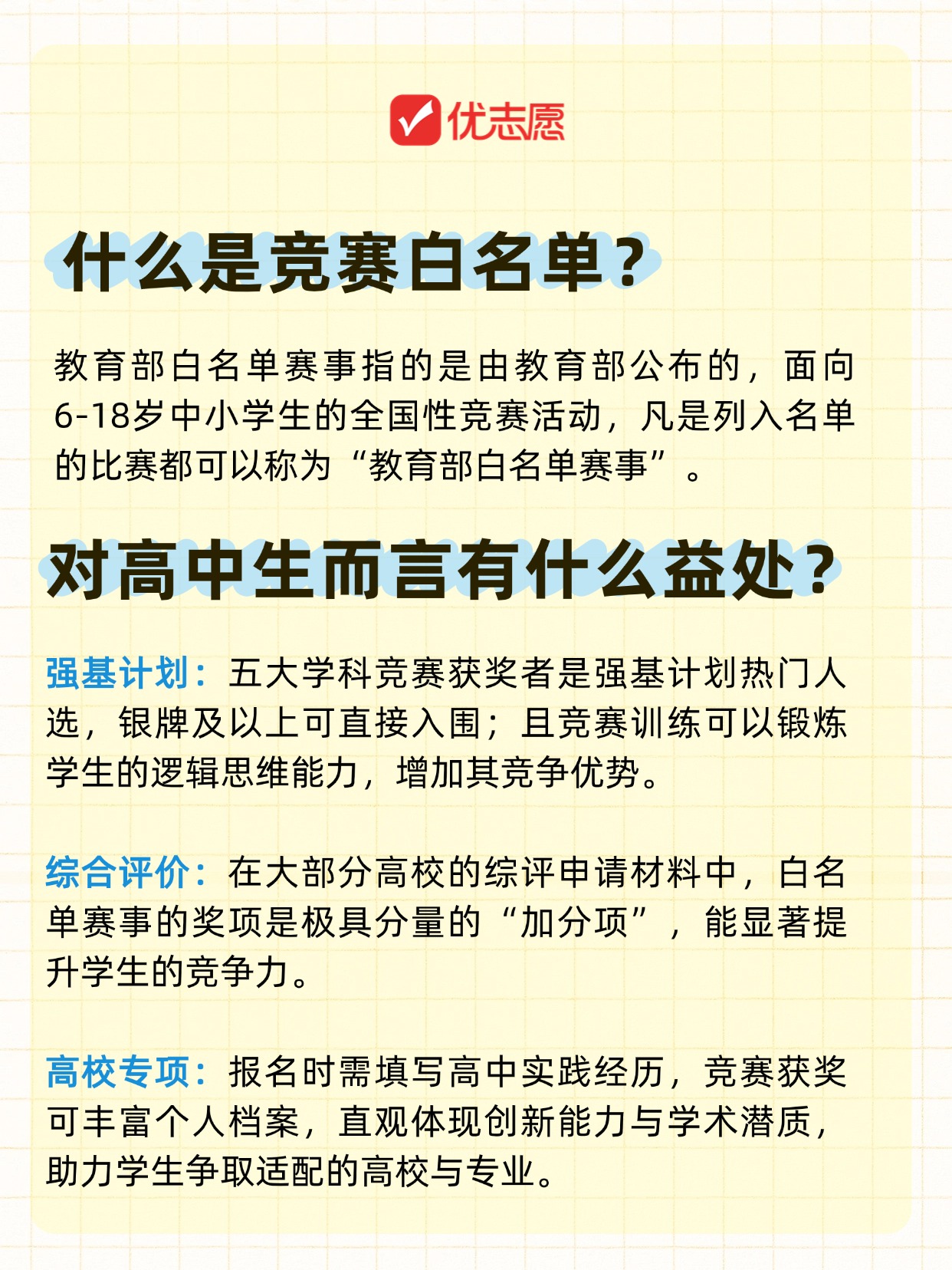 白名单赛事,全称为 “面向中小学生的全国性竞赛活动名单”,是经教育部官方审核认定并公开发布的竞赛项目总称,具有权威性与规范性。