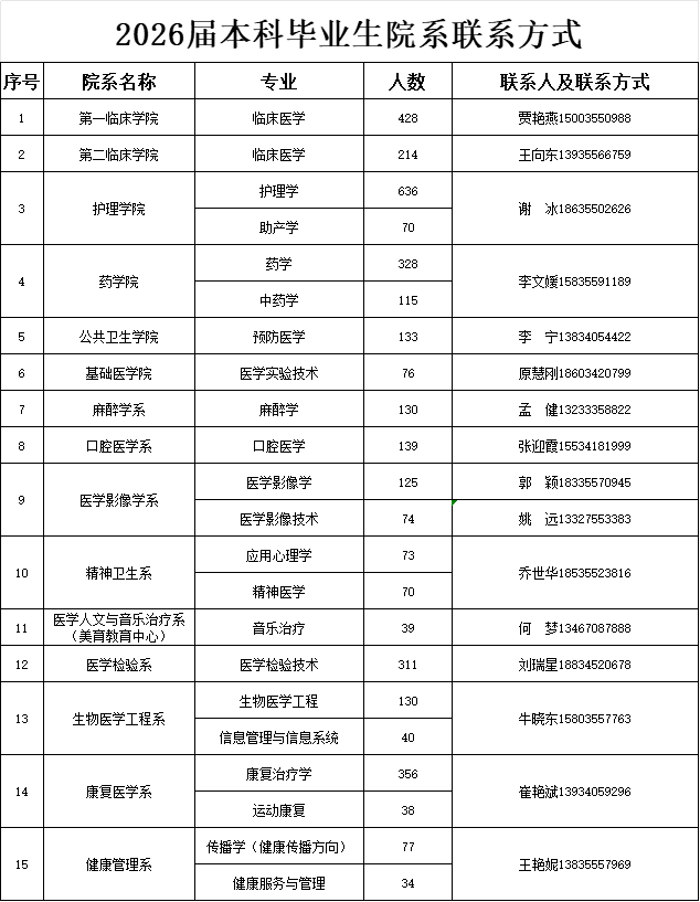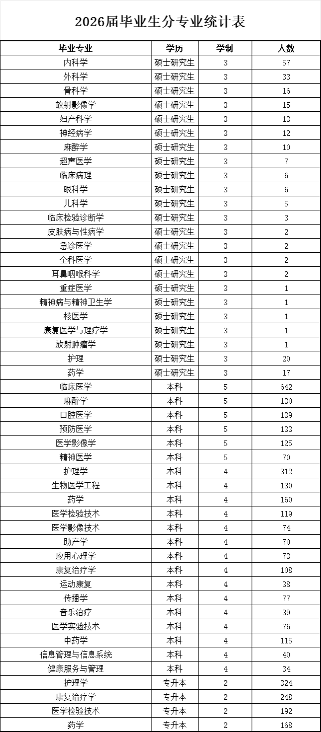 我校2026届毕业生总人数预计3869人,其中本科毕业生预计3636人、硕士毕业生预计233人。分专业统计表、院系联系方式附后。