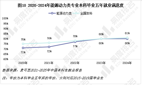 就业率和就业薪资带动了就业满意度的增长,能源动力类专业毕业五年的满意度也在逐年提高,当下已和全国平均满意度基本持平。