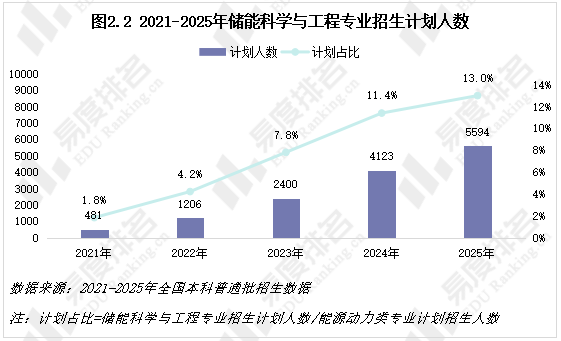 2025年储能科学与工程专业计划招生5594人,较2021年翻了了10倍以上,专业占比也从1.8%上涨至13%。