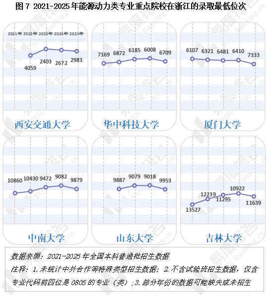 下图展示了部分985高校能源动力类专业在浙江的录取情况。新能源的快速发展带动了能源动力类专业的扩招与报考,2021-2024年各985院校能源动力类专业的最低录取位次普通上涨,而2025年则迎来了增长瓶颈,录取位次不增反降。