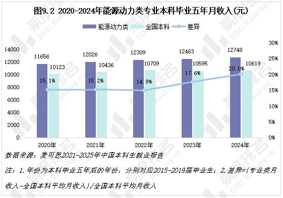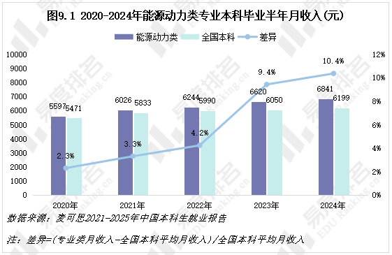 除就业率外,能源动力类的薪资待遇也持续增长,相比全国本科平均收入,该专业类的领先幅度不断增加。截至2024年届毕业生,其月收入为6841元,排在所有专业类的第7名。