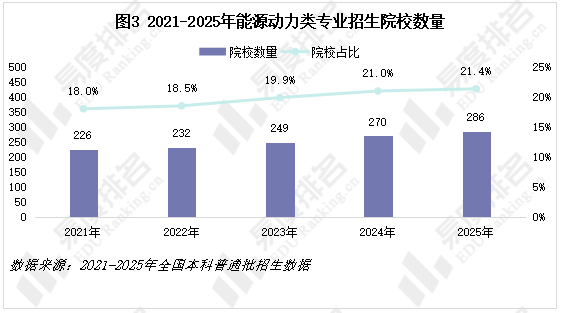 在全国高等教育扩招的大趋势下,本科高校数量不断增长,开设能源动力类专业并有招生计划的高校数量也同步增长。今年共有286所本科院校的能源动力类专业在全国普通本科批招生,较2021年增加了60所,2025年在全国本科院校中的占比超过21%。