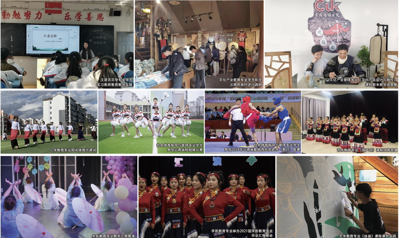 艺术教育在云南省高校本科专业综合评价中排名第一,文化产业管理排名第二,社会体育指导与管理排名第三;荣获“优秀教学团队”等诸多奖项;建成省级一流课程1门、省级教学改革项目3项;出版专著、教材15部;立项省厅级以上项目32项,获专利授权8个。