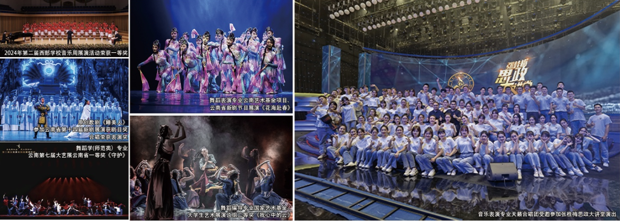 音乐与舞蹈学院现拥有教学质量工程建设项目20余项;国家艺术基金项目3项;云南省优秀专业教学团队2项;省级精品课程2项;云南省高等学校教学改革研究项目2项;省专业综合改革试点项目1项;省“十二五”规划教材7部;省级精品教材3部;省级优秀教材1部。由学校独立打造的舞蹈作品《哀牢廽响》《茶马古道》《阿密车》《重彩・佤山》,先后在全国舞蹈顶级赛事 “中国舞蹈荷花奖” 中斩获金奖、银奖、铜奖;近年来师生在全国桃李杯、金钟奖、云南省青年演员、新剧目展演等高水平专业赛事中获奖百余项,多次受邀参加央视、文化和旅游部、云南省政府组织的重要展演活动。