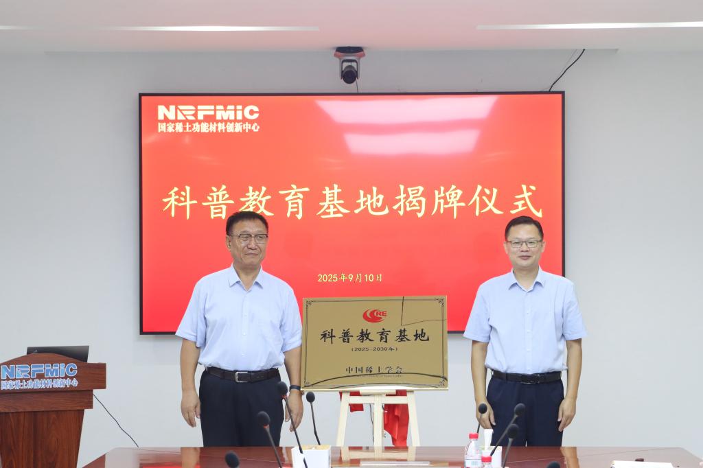 本网讯 9月10日,国家稀土功能材料创新中心获批“中国稀土学会首批科普教育基地”,揭牌仪式在该中心举行。中国稀土学会理事长李波,副理事长兼秘书长、国家稀土功能材料创新中心专家委员会委员杨占峰、副秘书长喻晓军,江西理工大学党委常委、副校长熊志华,赣县区科协主席黄谋茼,国家稀土功能材料创新中心董事长王伟生等出席仪式。