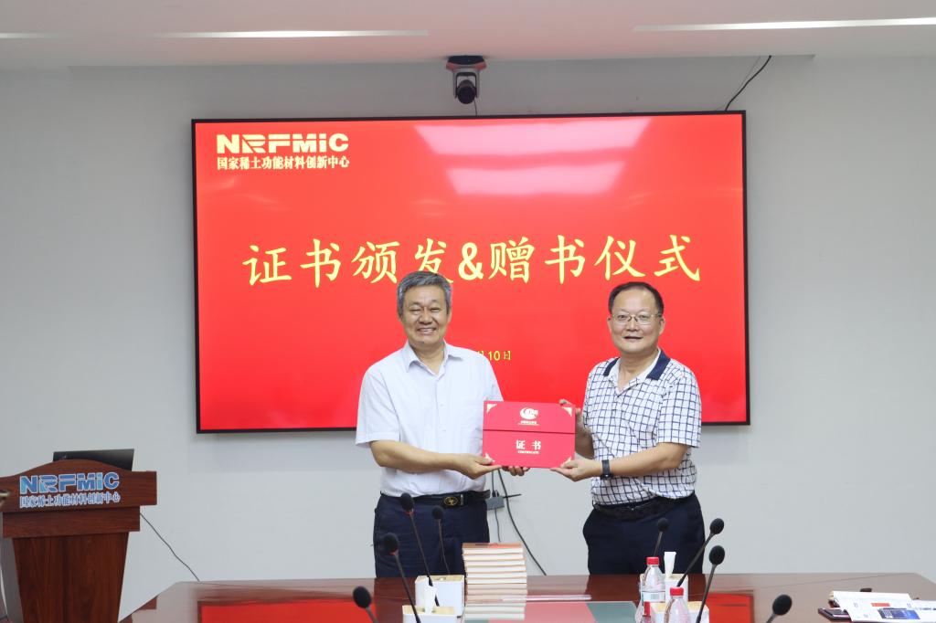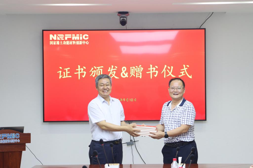 李波、熊志华共同为国家稀土功能材料创新中心科普教育基地揭牌。杨占峰向国家稀土功能材料创新中心颁发科普教育基地证书并赠送学会组织编写的《中国稀土学科史》。