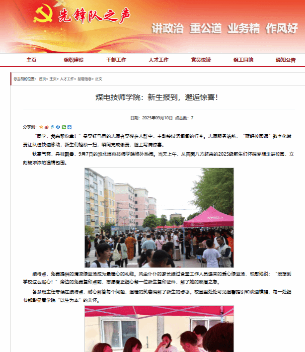 秋高气爽,丹桂飘香,9月7日的淮北煤电技师学院格外热闹。当天上午,从四面八方赶来的2025级新生们怀揣梦想走进校园,立刻被浓浓的温情包围。