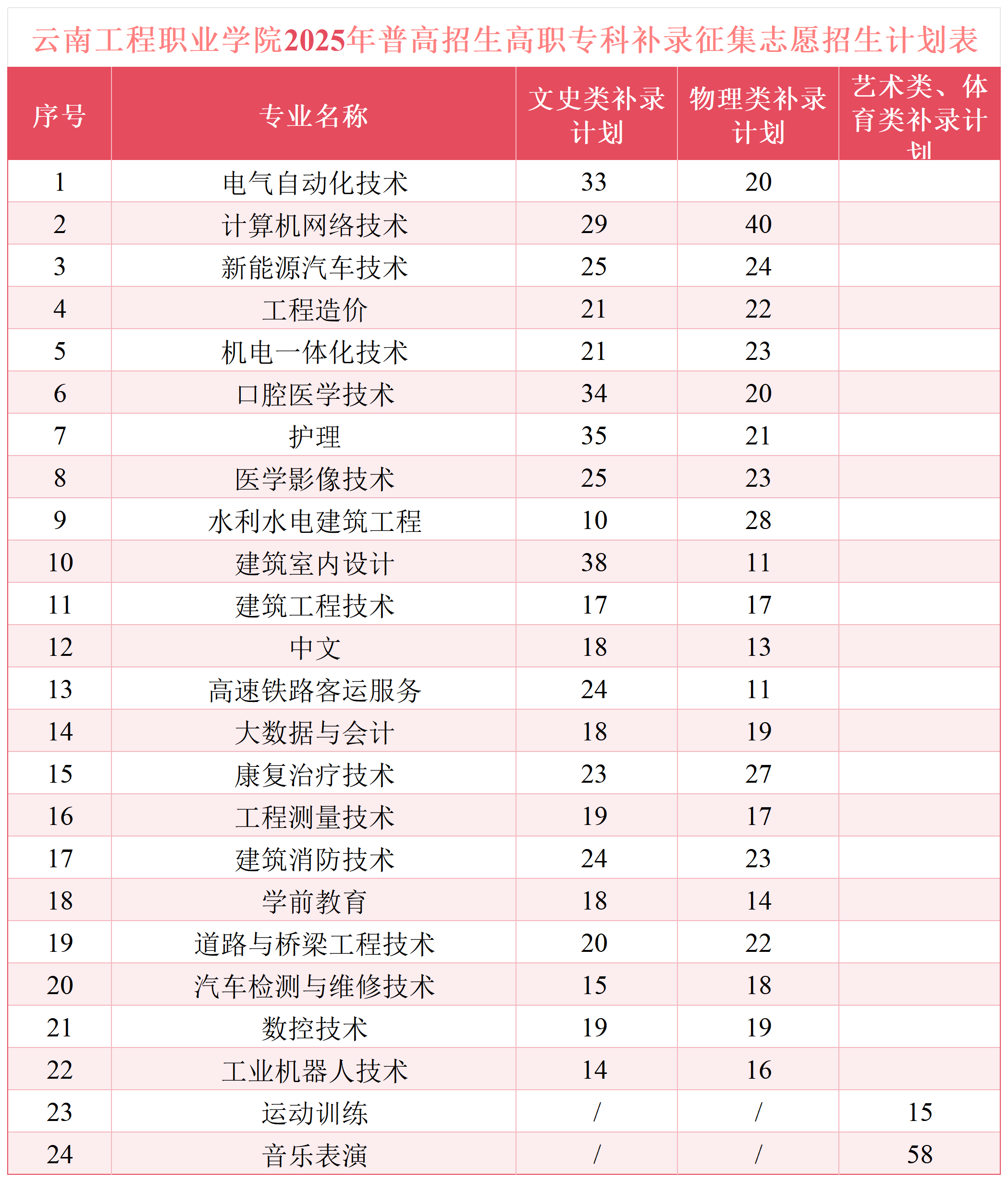 为满足未录取考生升学愿望,定于2025年9月13—14日进行云南省省内高职(专科)补录征集志愿工作。现学校部分专业尚有空余计划参加补录征集志愿,具体相关信息如下: