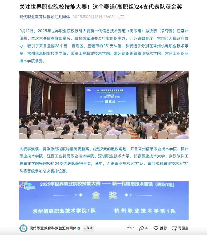 现代职业教育科教融汇共同体:关注世界职业院校技能大赛!这个赛道(高职组)24支代表队获金奖
