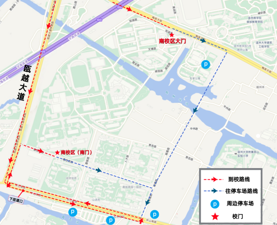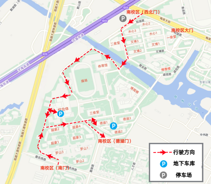 1.校外行车线路图如下(南校区南门道路设置为西向东单向行驶):