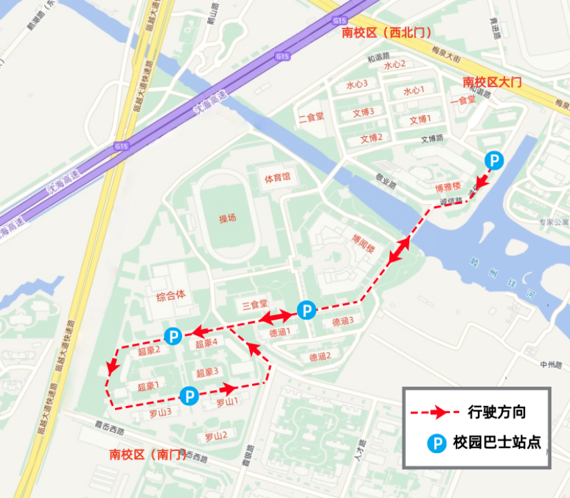 3.校内有免费校园巴士服务新生,站点设置在立德楼东南面、德涵转盘、综合体南面、罗山转盘,线路图如下: