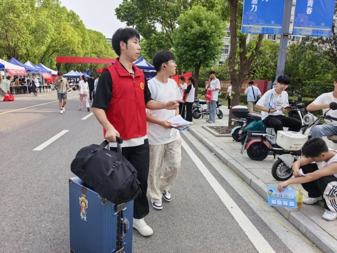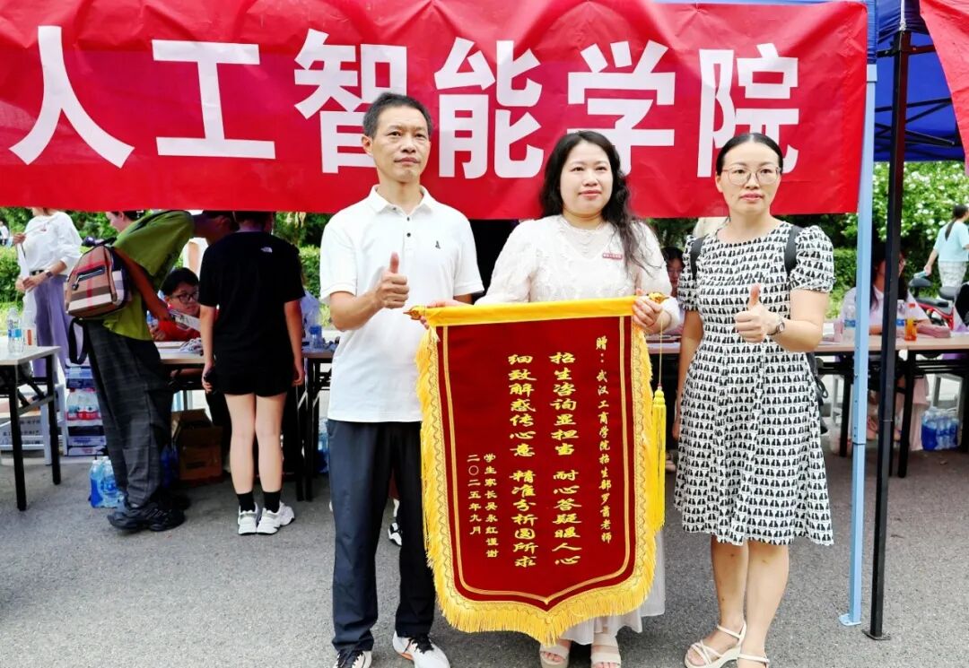 迎新现场出现了温情一幕,学校人工智能学院新生吴苏轩的家长将一面锦旗送到招生与就业工作部工作人员罗茵手中,感谢她在填报志愿期间专业热情、耐心细致的指导与服务。