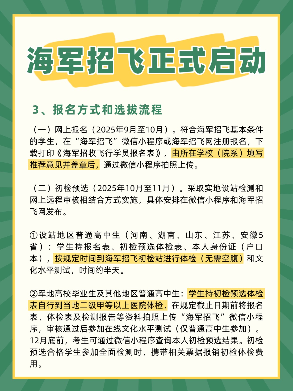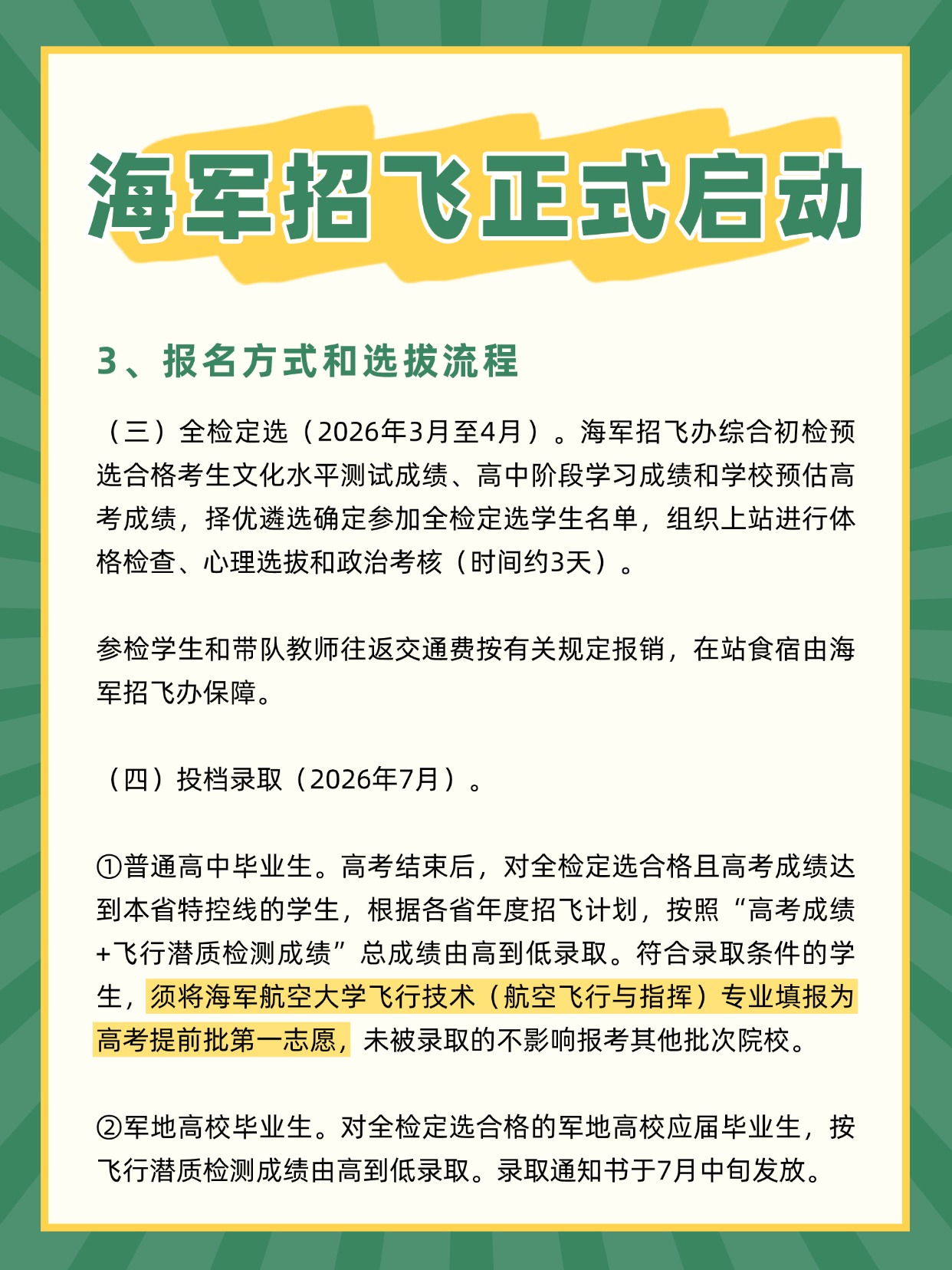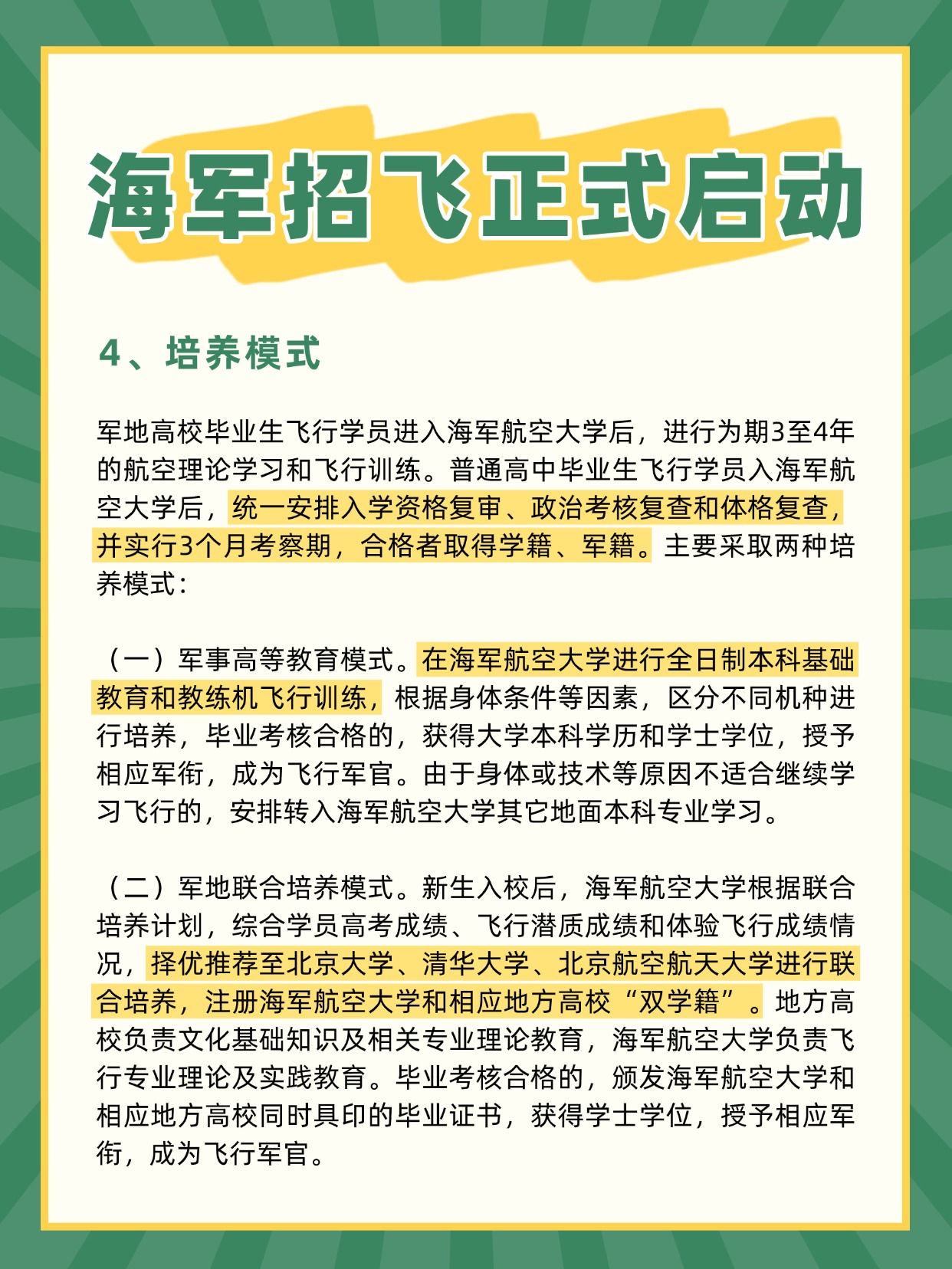 海军舰载机飞行员招飞属国家行为,在教育部、公安部及军委机关领导下,由海军会同相关省份教育、公安部门组织,纳入全国普通高校招生体系,海军招飞办负责选拔工作。录取学员主要在海军航空大学学习训练。该校是全军重点建设院校、最早高等学历教育院校之一,为海军培训规模最大院校,且是全军唯一拥有海湾、海军唯一拥有机场的院校,被誉为 “海空骄子的摇篮”。