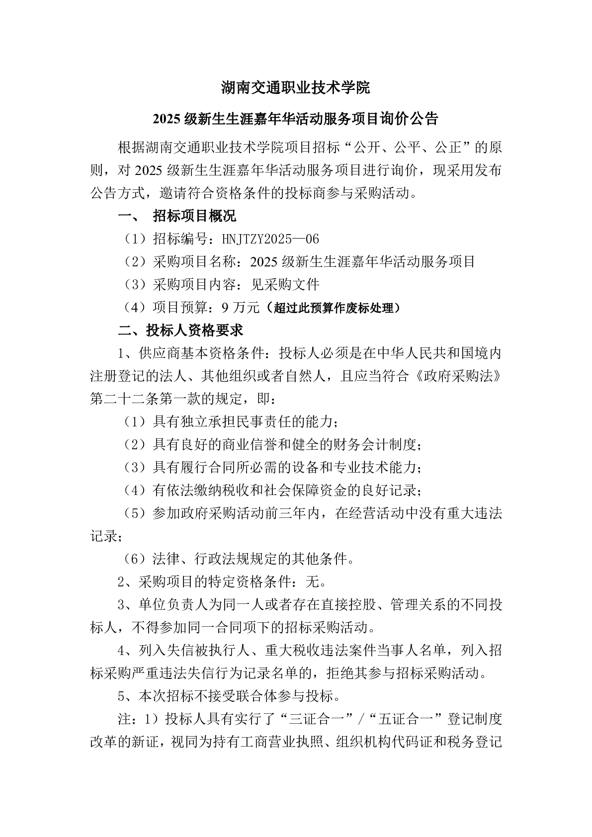 学院2025 级新生生涯嘉年华活动服务项目询价公告