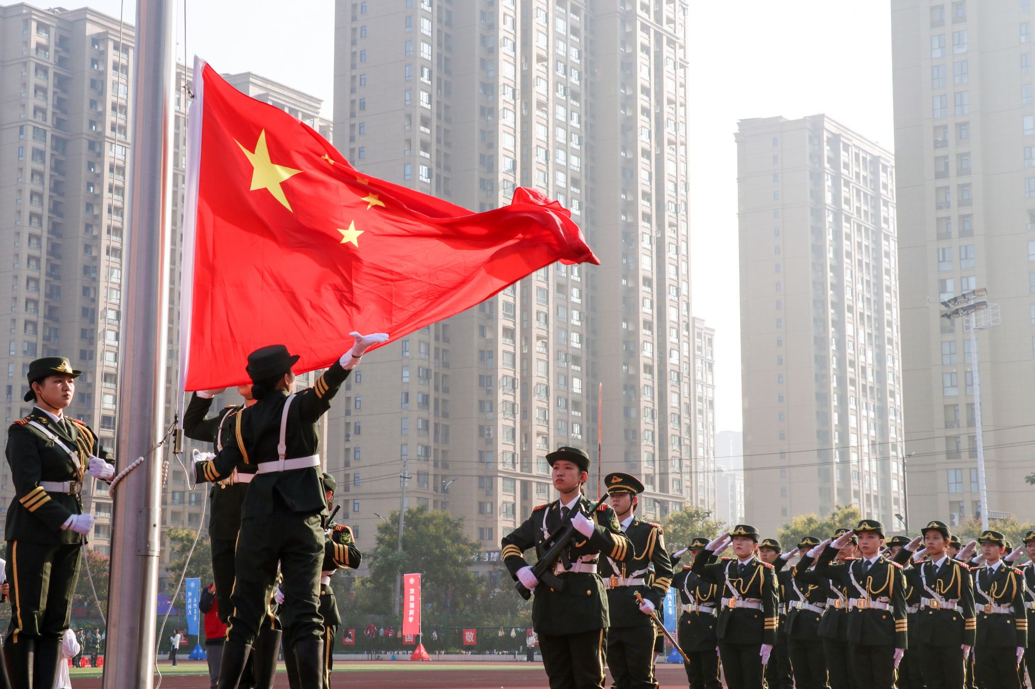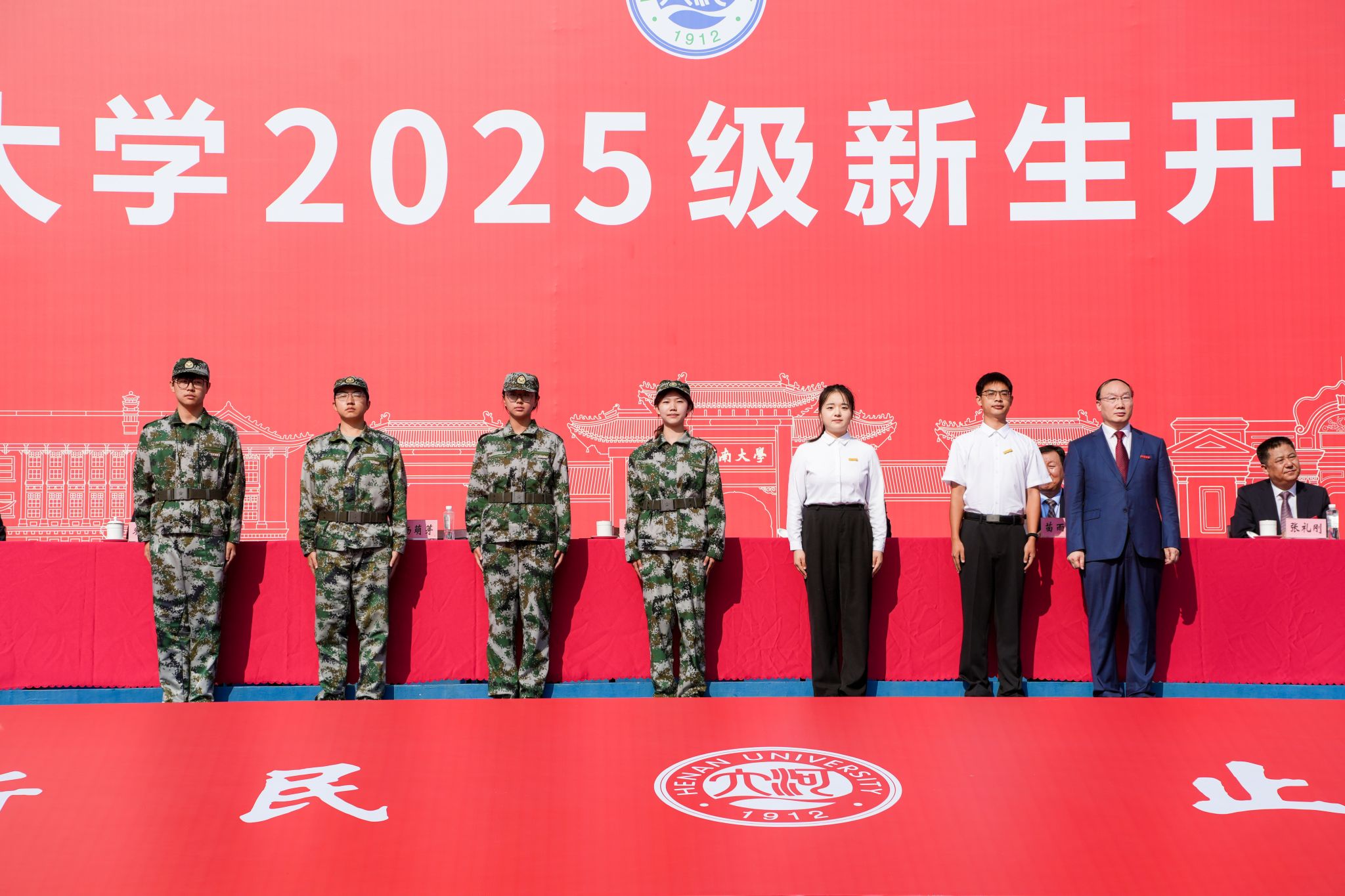 校党委书记季波代表学校向全体新同学的到来致以热烈欢迎,并宣布河南大学2025年新生开学典礼开始!国旗队身着礼服,肩擎国旗,神情庄重,迈着铿锵有力的步伐整齐入场。庄严的国歌声响起,升旗手挥旗展旗,鲜艳的五星红旗迎风冉冉升起。随着雄壮的国歌声响彻校园,典礼正式拉开了帷幕。