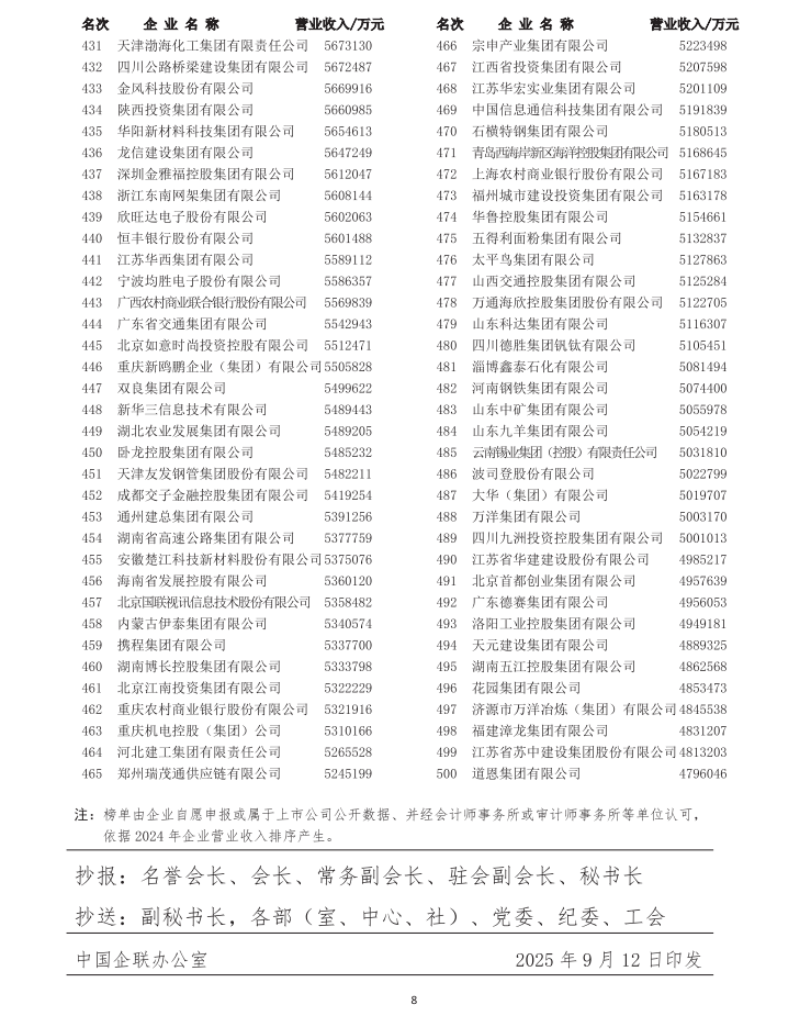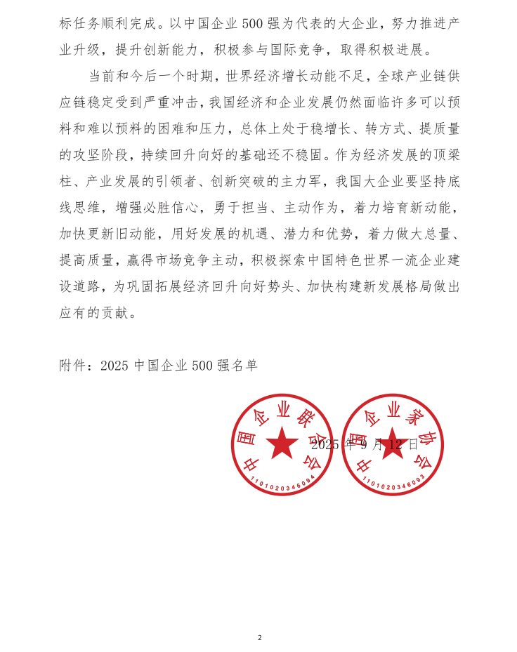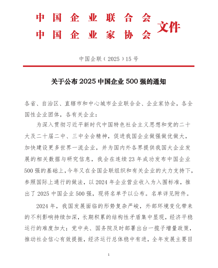 9月15日,中国企业联合会、中国企业家协会(简称“中国企联”)在京召开新闻发布会,发布“2025中国企业500强”榜单。